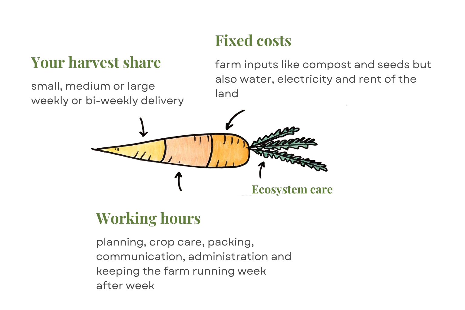 By buying a share for the whole season in advance, you make it possible for us to have the capital we need at the beginning of the season — when we buy seeds, plants, and equipment. At the same time, this commitment makes the farm more independent from fluctuating market prices and supplier contracts.